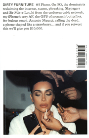 Dirty Furniture 5/6: Telephone isbn 9780993351143 Dirty Furniture Idea Code 21566 $26.00 Continuing its focus on uncovering the relationship between people and the things around us, the independent design magazine’s fifth issue investigates the phone. Dive headlong into the world of 5G, dominatrices reclaiming the internet, scams and phreaking, the undersea cable network, inventor Antonio Meucci, the GPS of monarch butterflies, calling the dead, and perhaps even a phone shaped like a strawberry. 144 p, ills colour & bw, 13 x 18 cm, pb, English